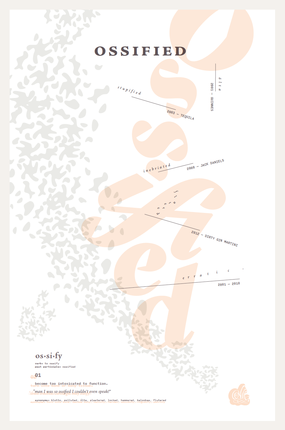 This poster was designed in response to an invitation to exhibit in the 30 Days Drunk exhibition hosted by Hyperakt, NYC in 2016. prompt, and uses original letterform designs and illustration to convey the feeling of instability and falling implied by the meaning of the word ‘Ossified’ in Ireland, which means inebriated, but also to play off of the more common meaning — to ossify: to turn to bone. The word Ossified is given a human-like shadow made out of the texture of bone, and the details of its wobbly stature are noted in type that evokes medical or botanical notation in freefall. This poster was awarded a Graphis Merit Award in the Type in Use category and is listed in the Graphis Typography 4 Annual ’18.